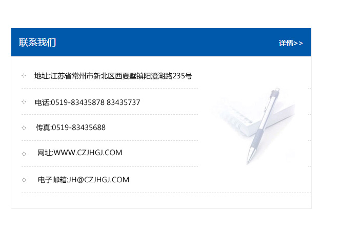 地址:常州市新北區友邦商務大廈1幢16、17層  電話:0519-85101652  傳真:0519-85112595  郵編:213022  網址:www.cz-jiayue_cn.115vips.com  郵箱:xiajifengaa@163.com